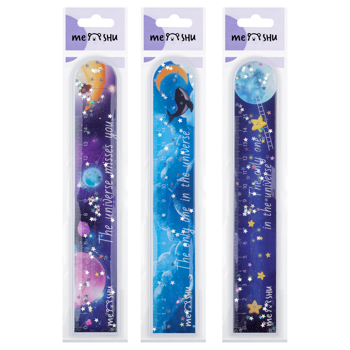 Линейка-шейкер MESHU Universe c блёстками — отличный помощник для школы и игрушка-антистресс. Достаточно её встряхнуть, чтобы в полной мере насладиться сиянием глиттера.Длина шкалы составляет 15 см, ширина линейки — 3,5 см. Гибкая линейка изготовлена из ПВХ. Представлена в трёх вариантах дизайна со сказочными сюжетами. Упакована в пакет.