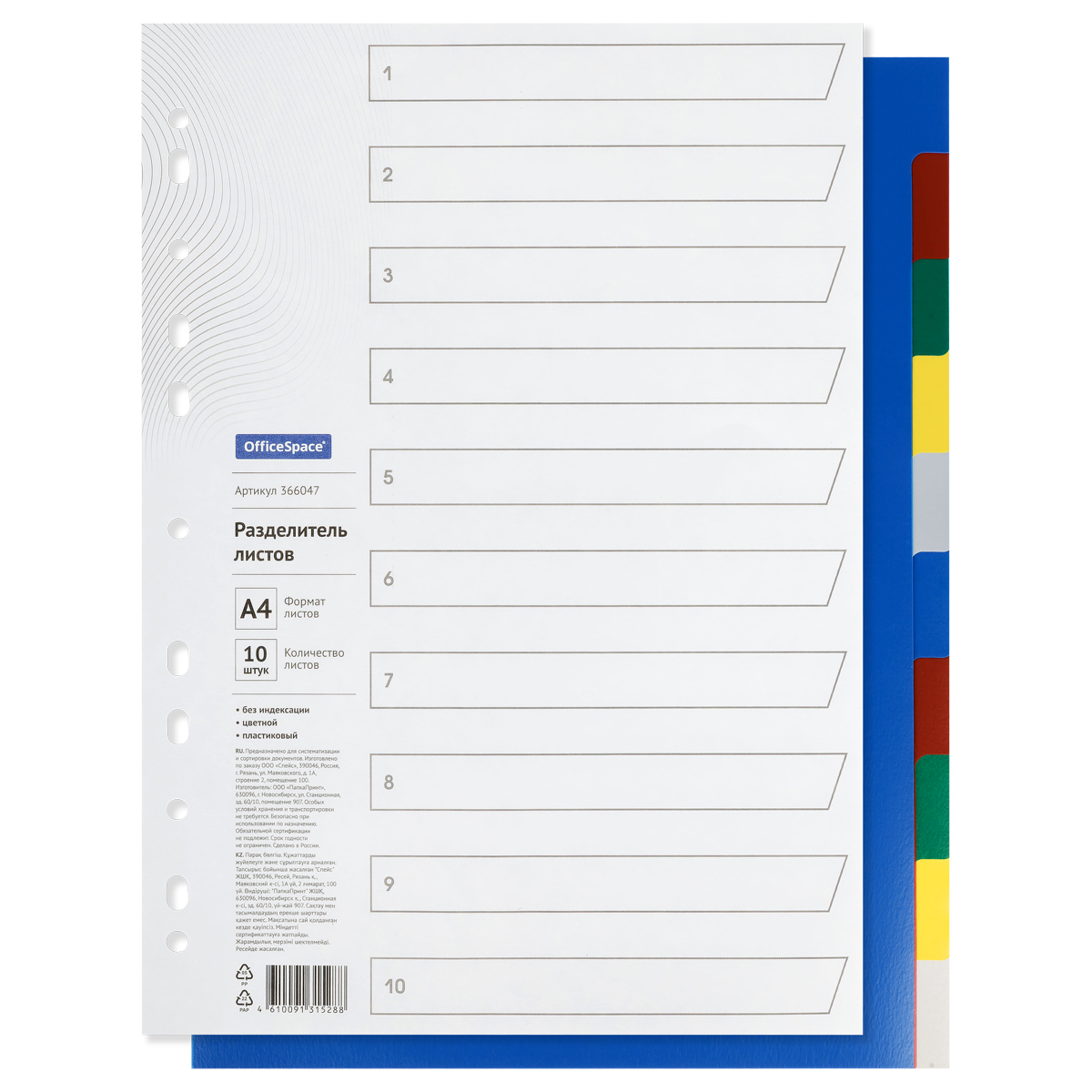 Пластиковые разделители листов OfficeSpace предназначены для сортировки и систематизации документов внутри папок, обеспечивают сохранность и аккуратность листов. В комплект входят 10 листов синего, красного, серого, зеленого и желтого цвета, а также титульный лист для оглавления. Размер 224*297 мм. Изготовлены из пластика толщиной 120 мкм. Удобны в использовании: перфорация позволяет подшивать разделители во все типы папок.• Размер: 224*297 мм;