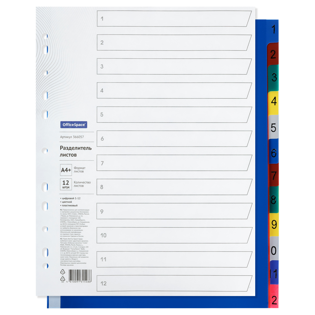 Разделитель листов OfficeSpace А4+, 12 листов, цифровой 1-12, цветной, пластиковый