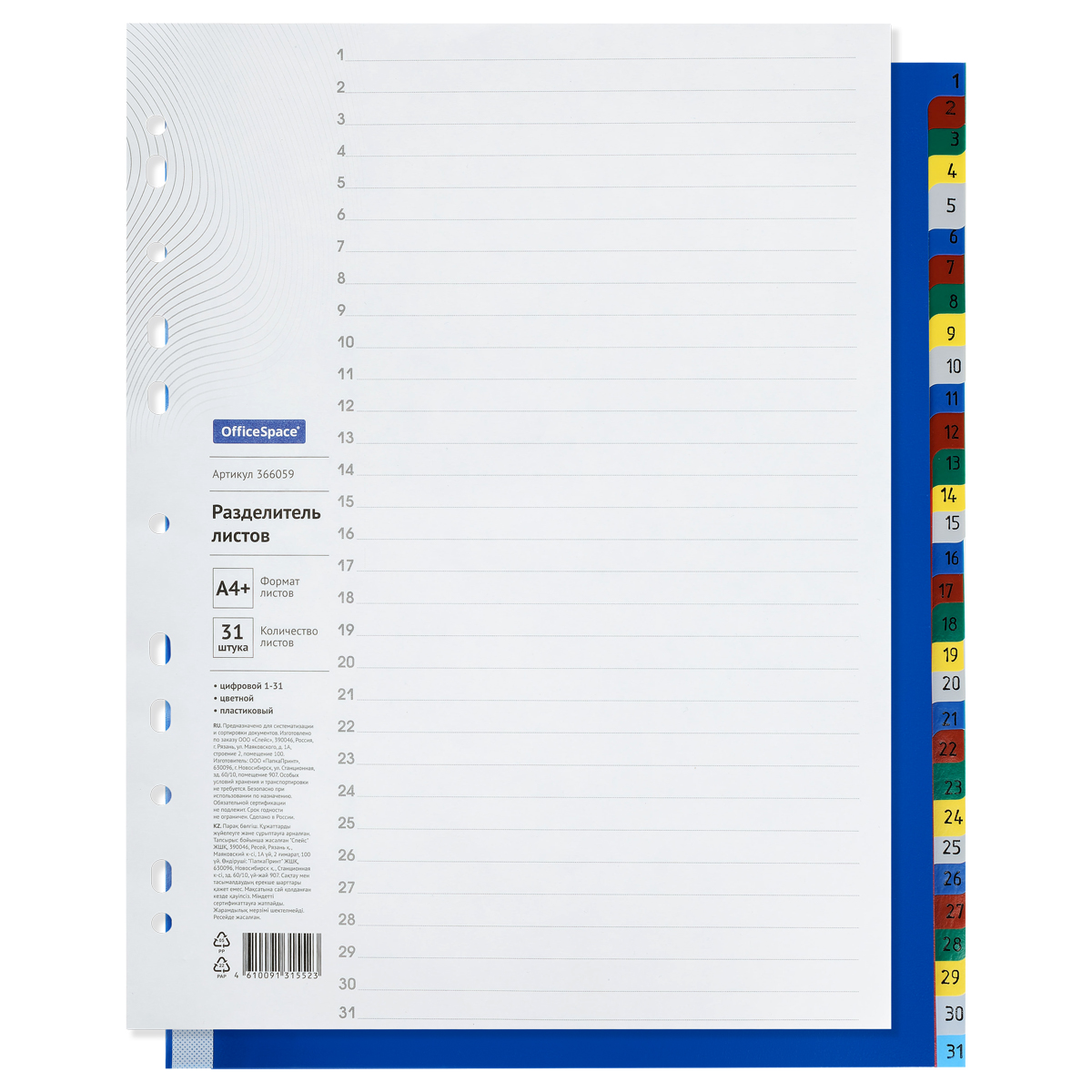 Разделитель листов OfficeSpace А4+, 31 лист, цифровой 1-31, цветной, пластиковый